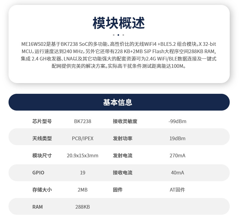 WiFi4+BLE5.2模块ME16WS02高运行速度远距离2.4G 不带DCDC