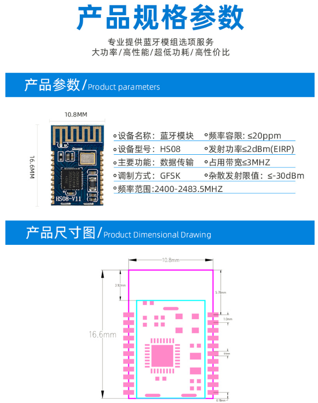HS08蓝牙透传模组支持低功耗蓝牙5.2小体积无线透 传数据模块